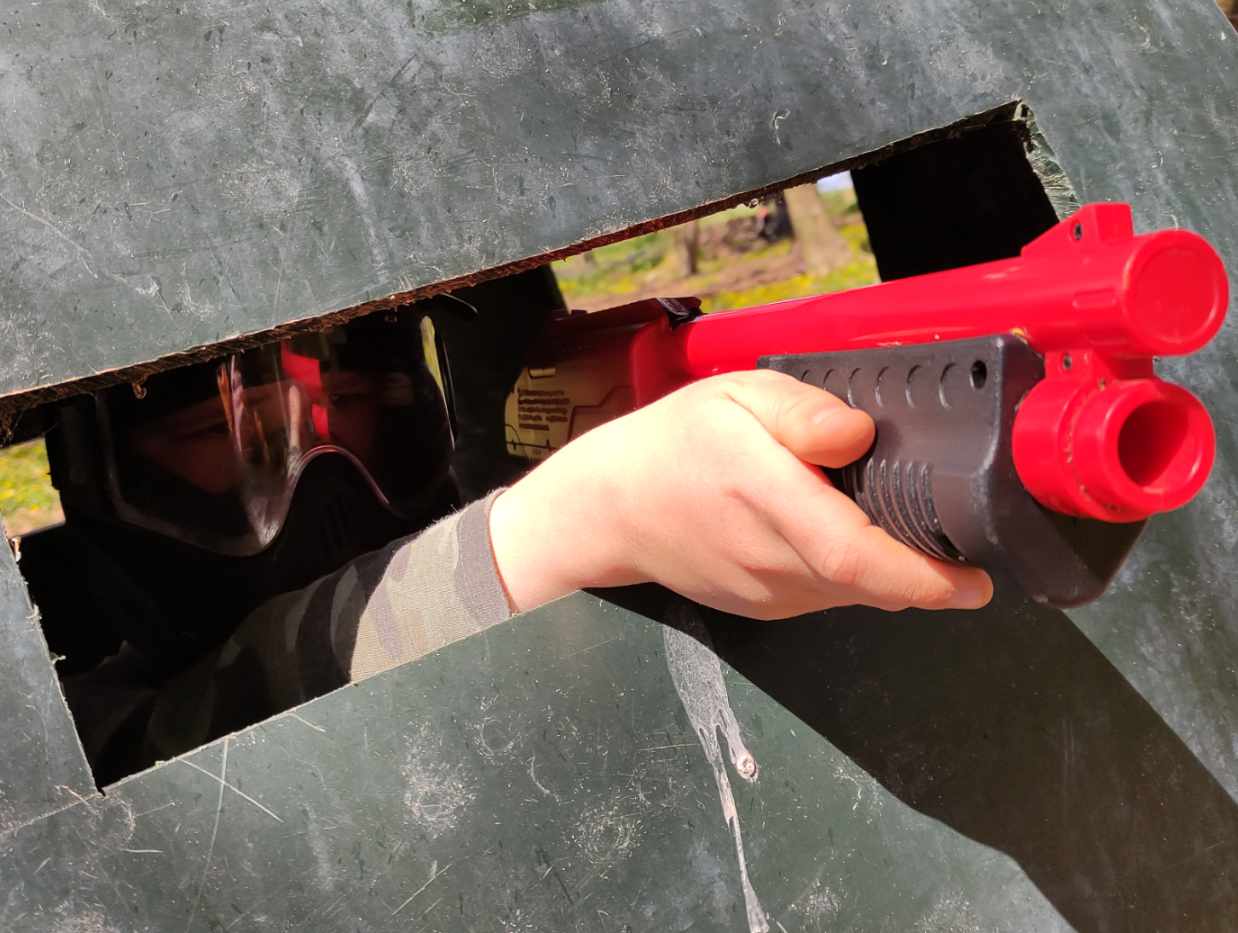 Armed with a pump action paintball shot gun the Splatmaster Z200 uses spring power instead of compressed air which gives a desired low impact velocity of around 140 ft per second with a range of 100 feet. At this velocity the impact is significantly less compared to the other markers we use as well as being lighter in weight and easier to operate.